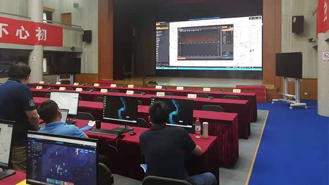 国家无线电监测中心指挥大厅主屏幕进行无人机布控工作汇报