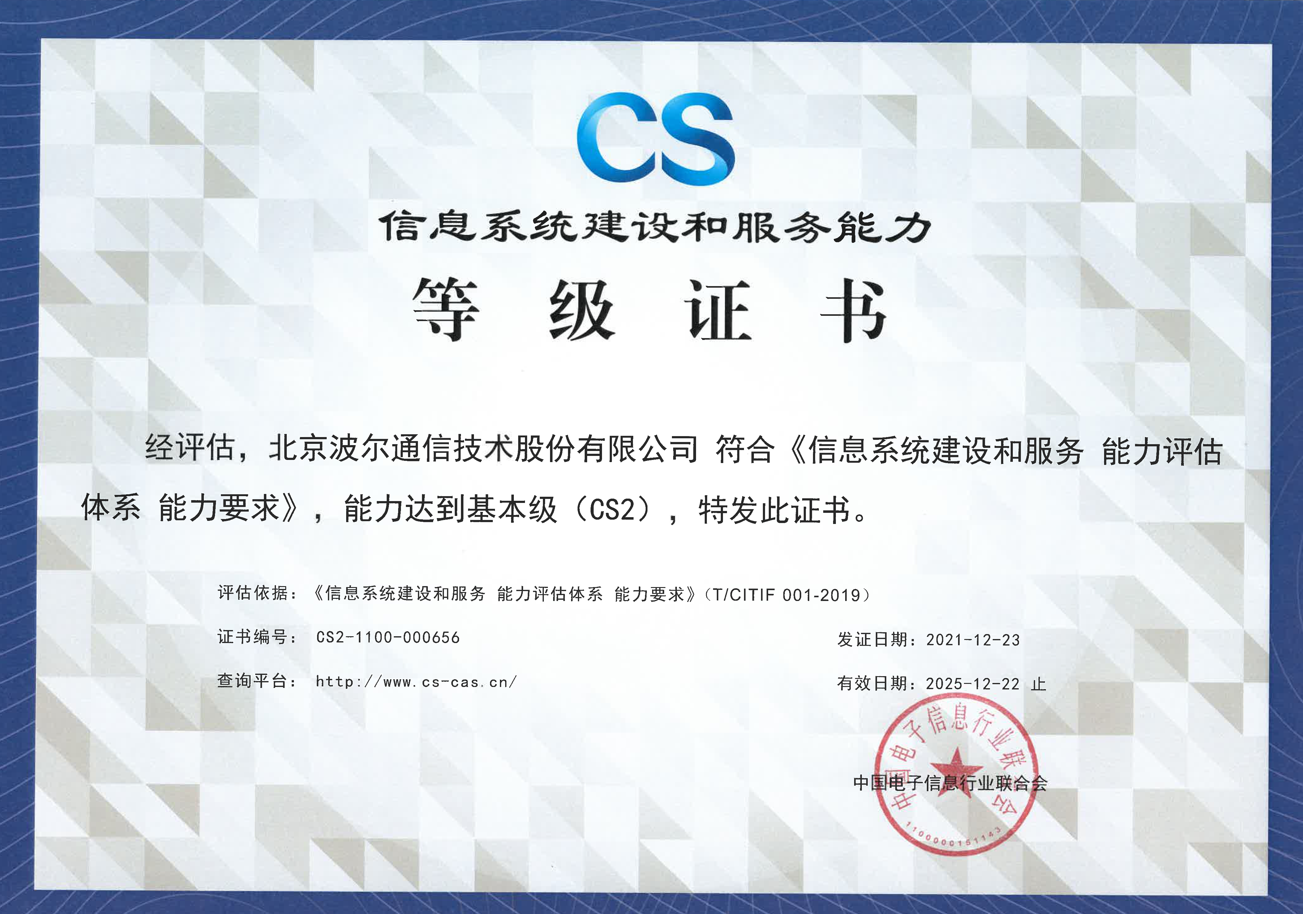 2021年12月16日经电子联合会专家评议会评审,北京波尔通信技术股份有限公司取得“信息系统建设和服务能力基本级(CS2)”资质证书。